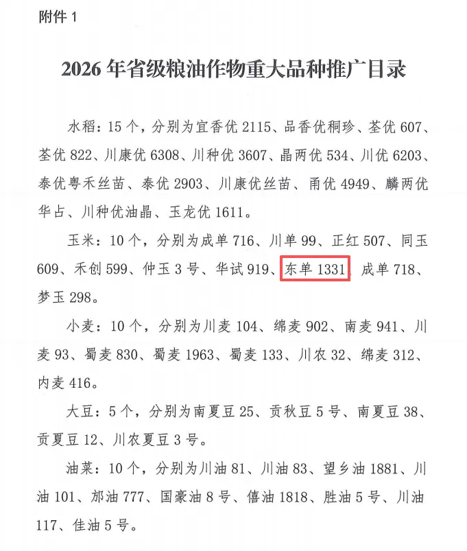 遼寧東亞種業自主培育的東單1331入選四川省2026年糧油作物重大品種推廣名錄。