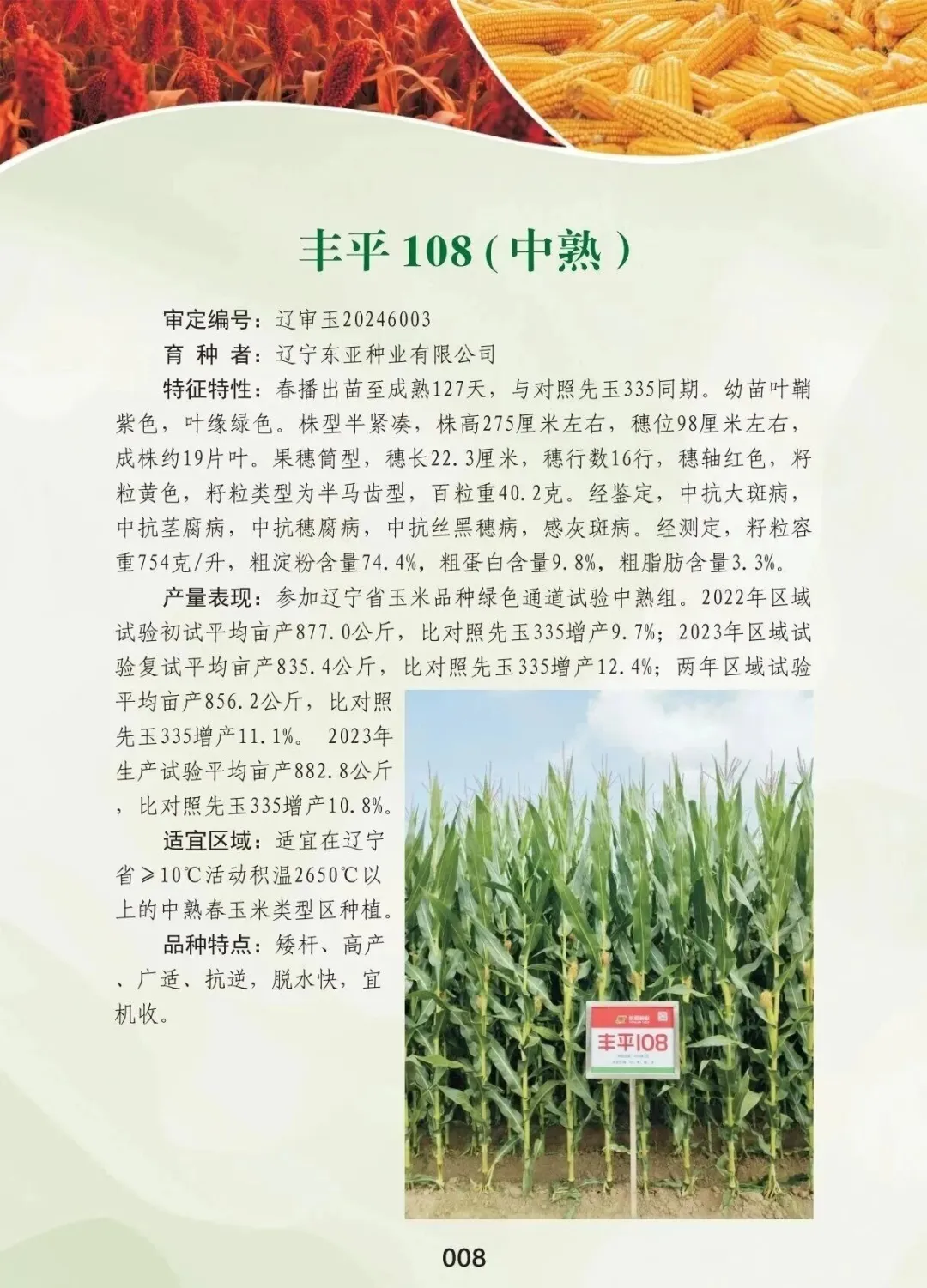 豐平108是遼寧東亞種業有限公司自主研發的中熟玉米品種,適宜在遼寧省≥10℃活動積溫2650℃以上的中熟春玉米類型區種植。